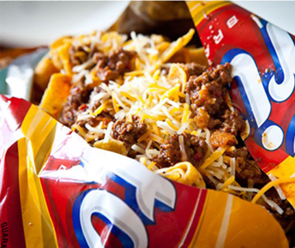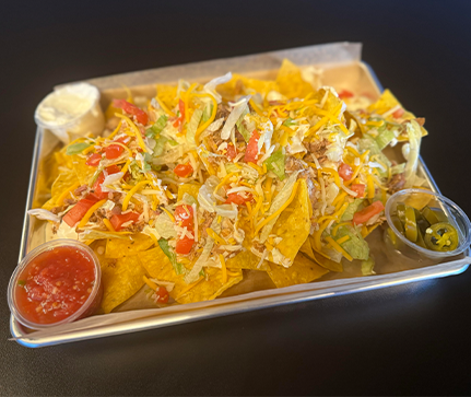 Dorito Bag filled with Ground Beef, Diced Tomatoes, Lettuce. Queso & Cheddar Jack Cheese. Served with Jalapeños & Sour Cream on the side.