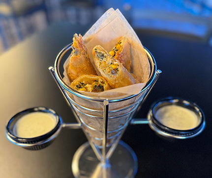 Flour Tortilla filled with Sausage or Bacon, Two Eggs, Cheddar Jack Cheese, Jalapeños, Tater Tots, Tomatoes, & Grilled Onions. Served with Salsa & Tater Tots.