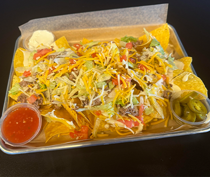 Topped with Lettuce, Diced Tomatoes, Cheddar Jack Cheese, & Queso. Served with Jalapeños, Salsa, & Sour Cream.