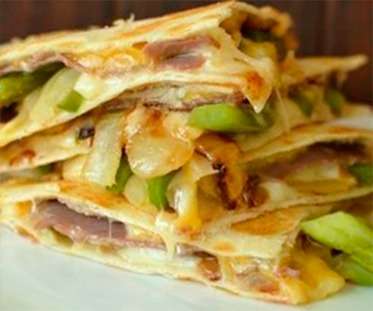 Flour Tortilla filled with Philly Steak, Cheddar Jack Cheese, Tomatoes, Bell Peppers, & Grilled Onions, Jalapeños, & Chipotle Sour Cream. Served with Salsa, Queso & Sour Cream.